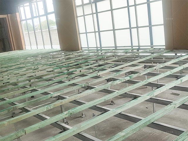 主席臺共200平米,采用楓樺木A級單層龍骨結構,場館的施工不同于標準的工藝,底層增加鋼架,用于增加主席臺的高度,即使工藝比較復雜,施工師傅們依然加班如期交付。地板鋪完很快就顯得演講臺高端了起來,地板后面為大的落地窗,白天陽光照耀,形成自然的演講臺燈光,A級地板的優點盡收眼底。