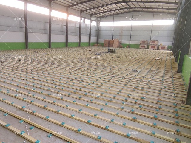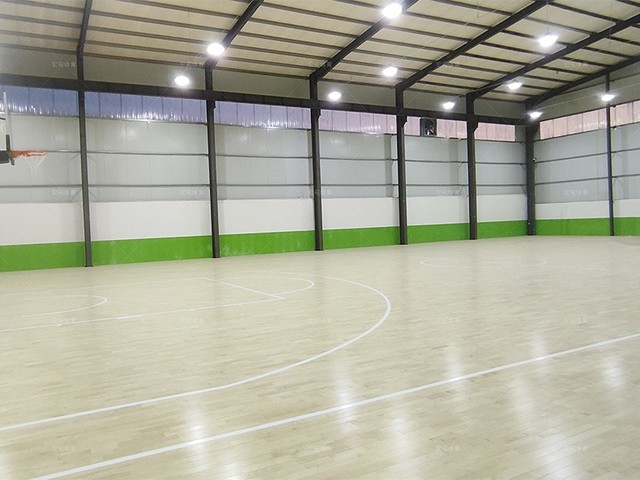 場地共1000平米,分為一個小的U6球場,和標準的籃球場;采用楓樺木A級加密龍骨結構。 面板光潔無瑕,不起毛刺,無結疤無色差,屬于面板中等級較高的;加密龍骨結構的配置,可以很大程度的感受到球體回彈不同,從普通地板球體回彈70%變成90%以上,可以達到比賽場館的要求。底層采用專利膠墊,環??稍偕?,不僅有提高球體回彈的作用,而且可以增加地板的穩定性,提高地板的使用年限。