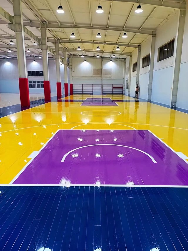 如果想要打造個性的球館,可以采用彩漆的方式實現,根據場館整體的裝修風格給場館的三秒區以及緩沖區繪制彩色氛圍漆以及個性LOGO增加場館的活力。