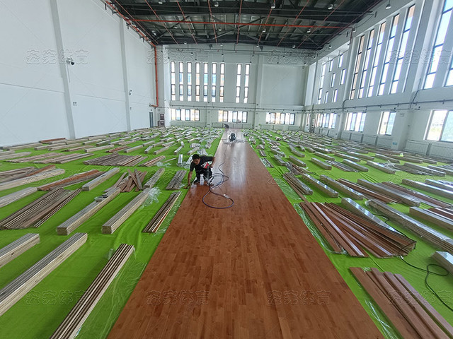 陜西岳瀆中學籃球館木地板施工中 東莞鉑銀全景式玻璃壁球館完工